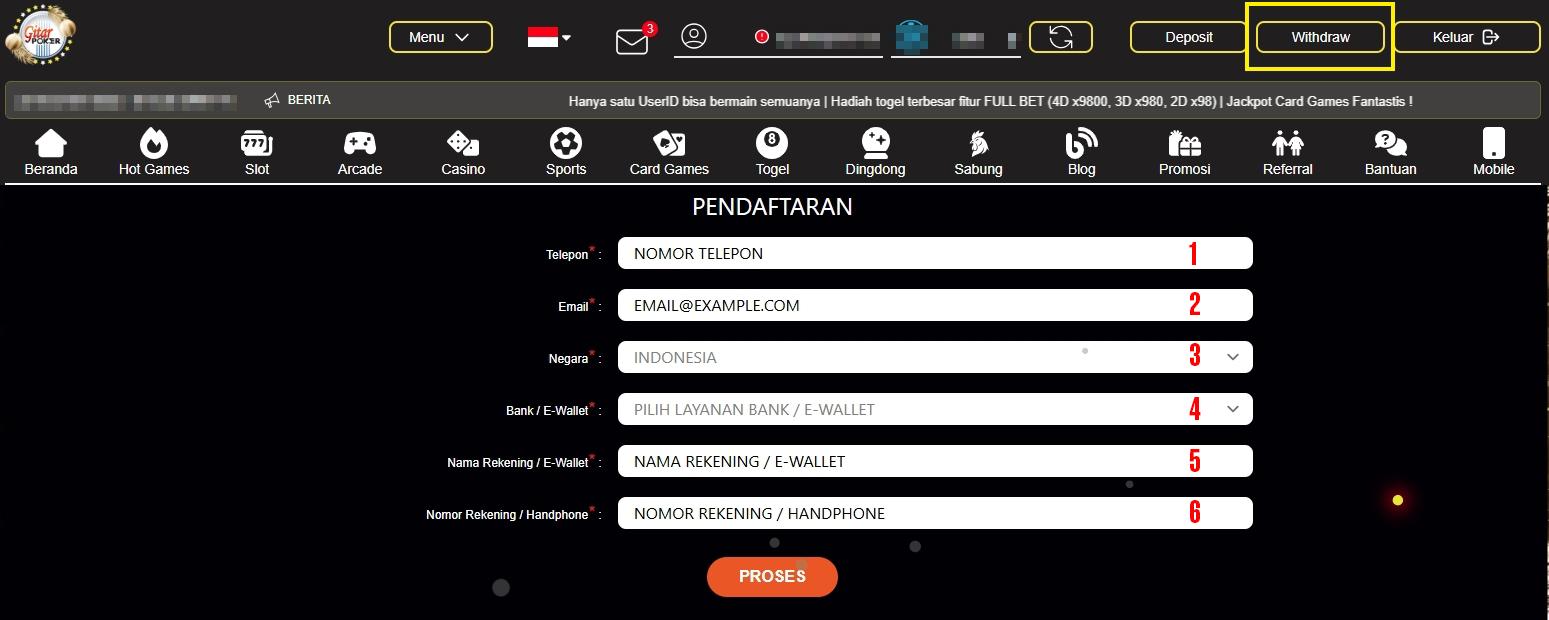 Withdraw adalah Cara tarik dana dari chips anda ke rekening bank yang anda daftarkan pertama kali.