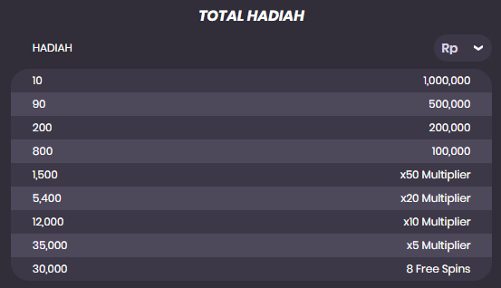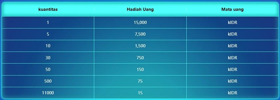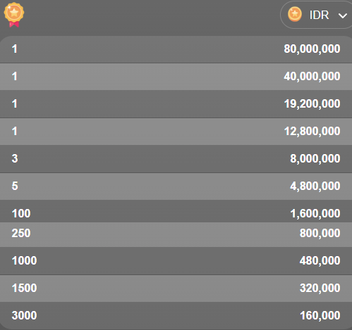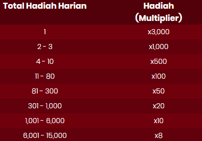 7. Pemain akan memenangkan hadiah berupa multiplier dari jumlah taruhan seperti yang tertera di Tabel hadiah.