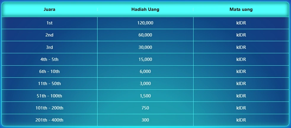 2. Jika Pemain berada di peringkat 1–300 pada waktu penutupan, Pemain akan menerima hadiah sesuai peringkat.