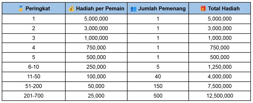4. Setiap turnamen akan memiliki 3.030 pemenang, dengan total 6.060 pemenang di kedua turnamen, diberikan secara acak kepada pemain yang beruntung.