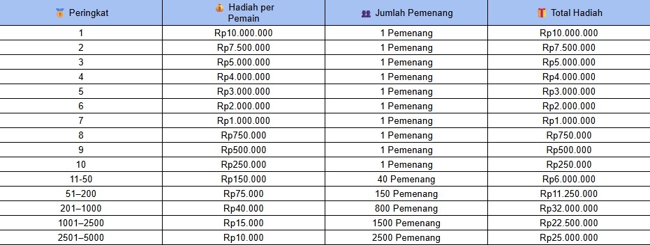 6. Hadiah akan dibagikan maksimal 2 hari setelah periode selesai.